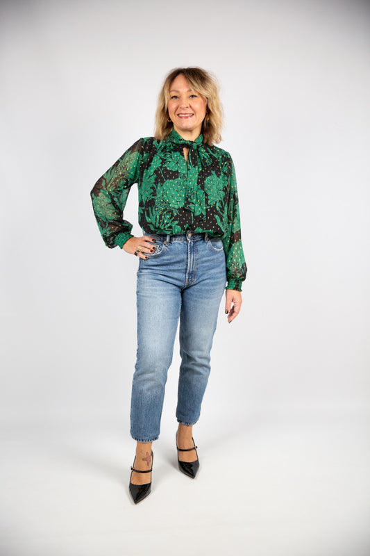 Motel diffusione moda blusa asimmetrica e bimaterica pizzo e satin