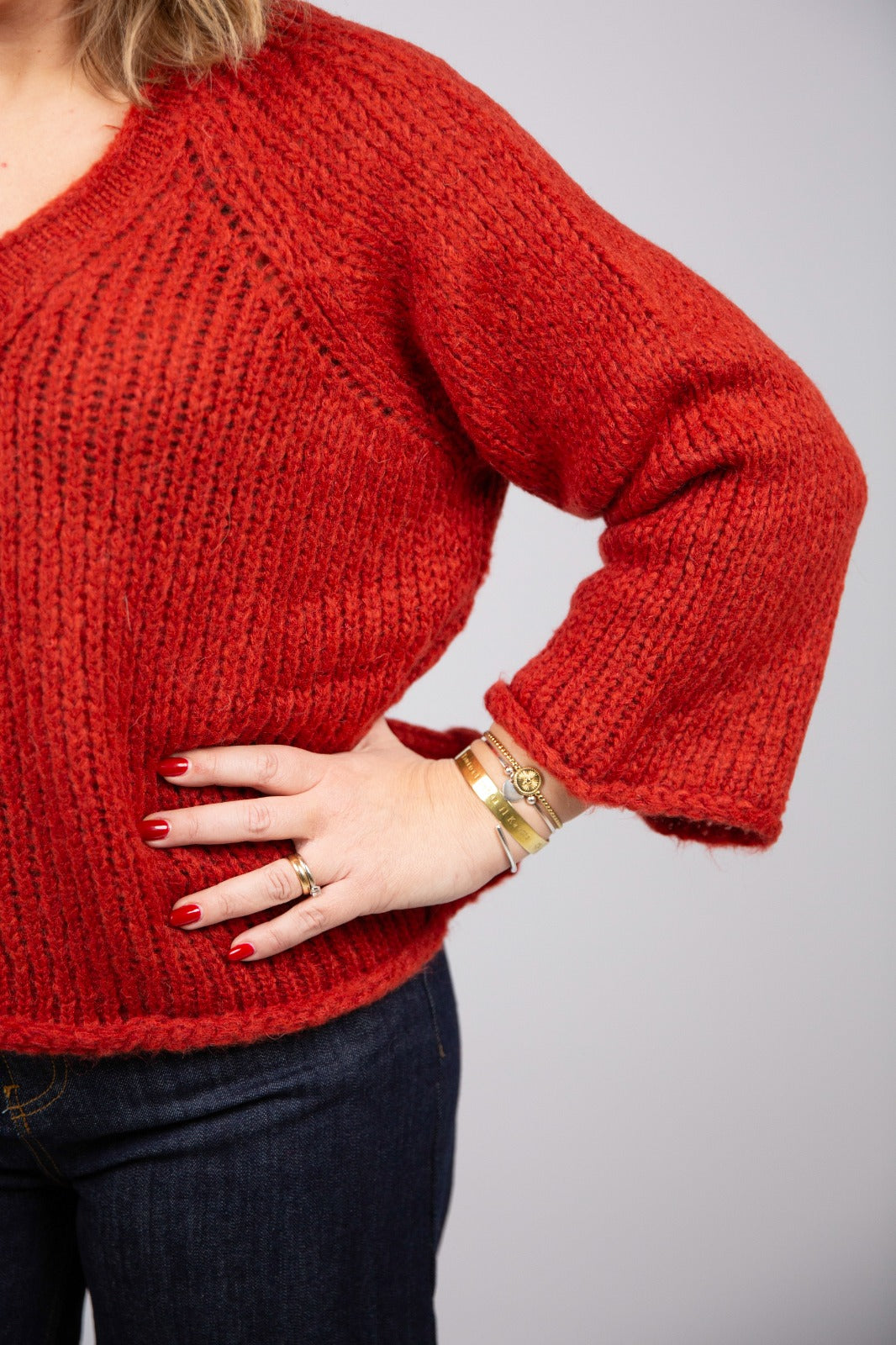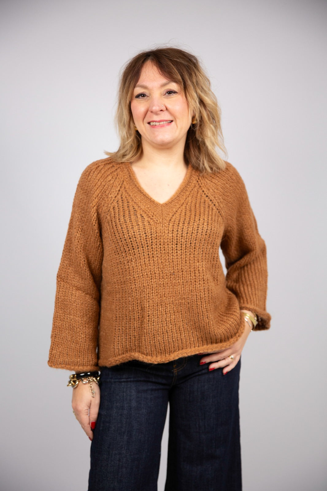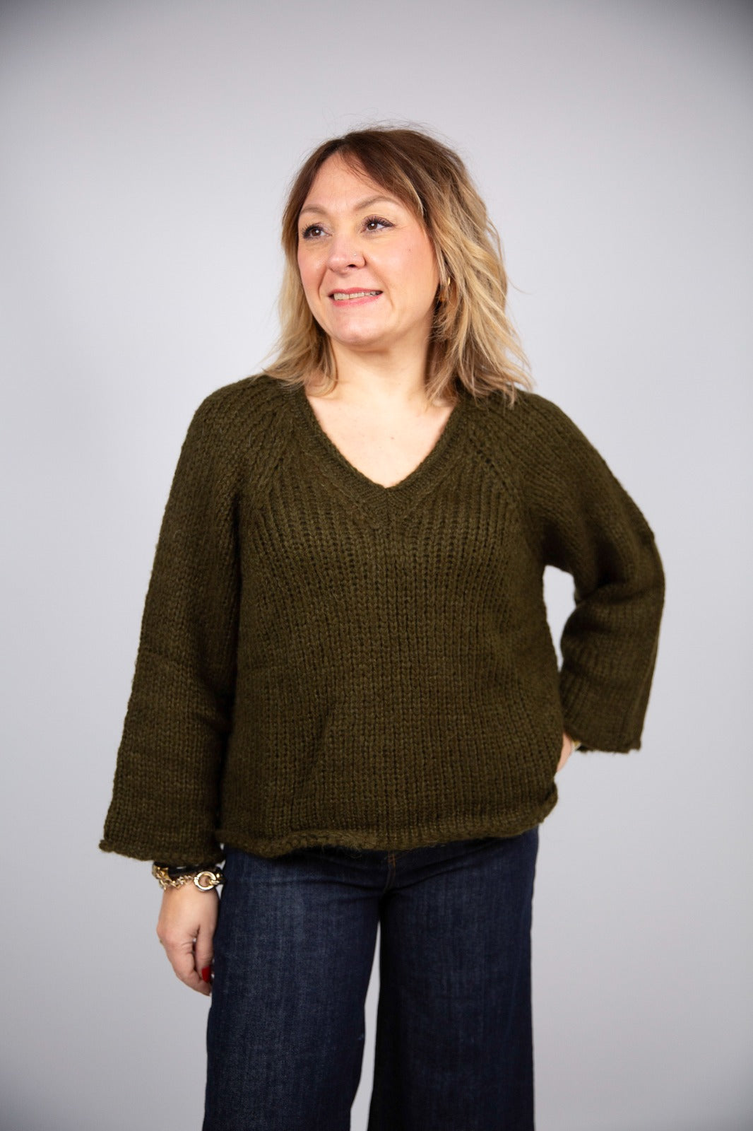 Il maglione con scollo a V si caratterizza per una linea femminile e avvolgente, arricchita dalla manica a campana che dona movimento e un tocco di eleganza al capo. La texture, realizzata con un filo più pieno e corposo, conferisce al maglione una presenza materica importante, mantenendo al tempo stesso una sensazione di morbidezza e comfort. La composizione in misto lana e mohair garantisce calore e leggerezza, creando un effetto soffice e leggermente vaporoso che valorizza la struttura del capo. Nel complesso, il maglione unisce stile e praticità, risultando ideale per completare outfit sia quotidiani sia più ricercati con naturale naturalezza.