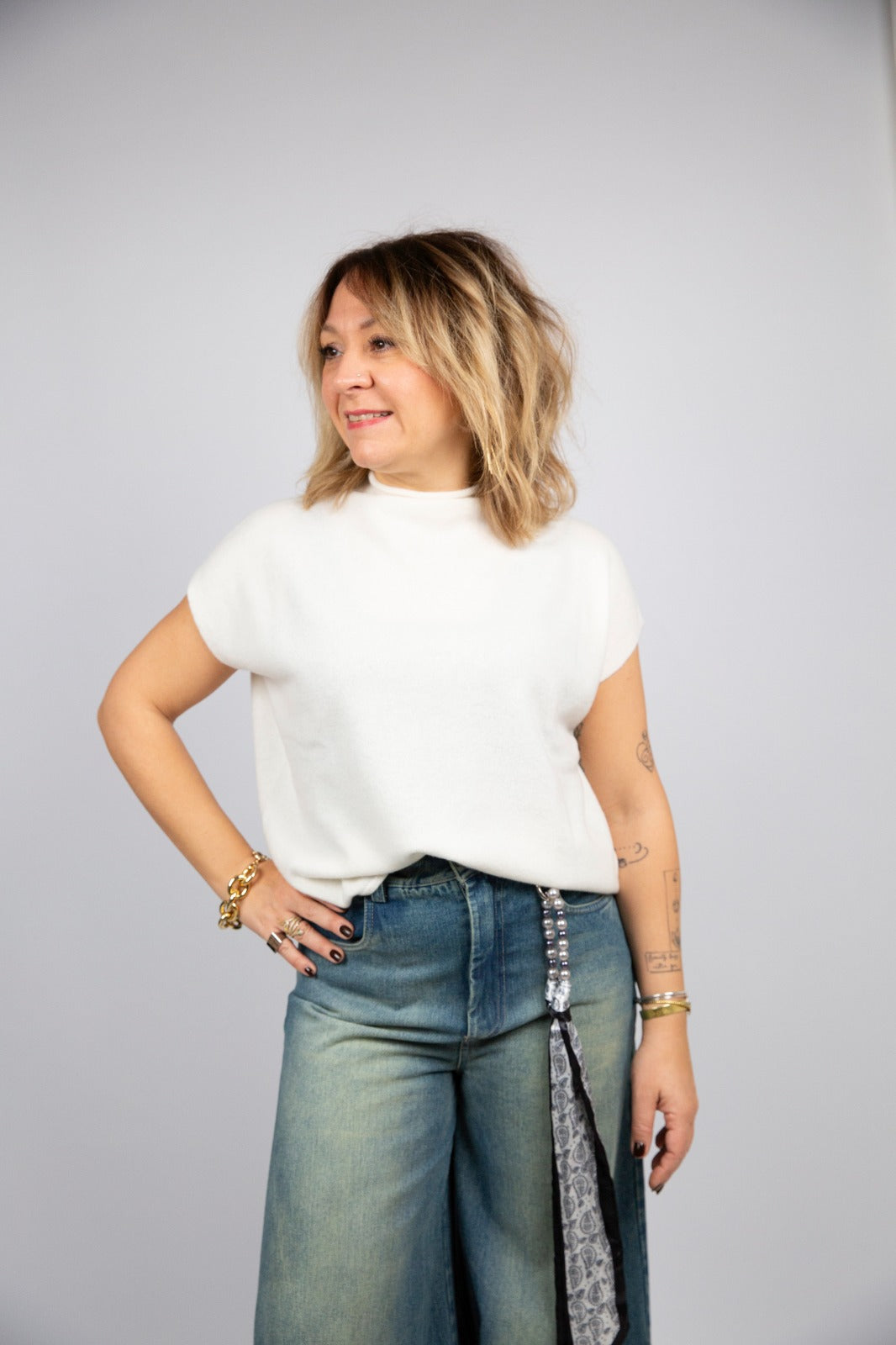 Gilet o t-shirt in 100% cashmere di altissima qualità, morbido e leggero sulla pelle. Il modello presenta un elegante collo a cratere e una manica scesa che dona una linea rilassata ma molto raffinata. È un capo essenziale e sofisticato, perfetto per aggiungere un tocco lussuoso a qualsiasi outfit.