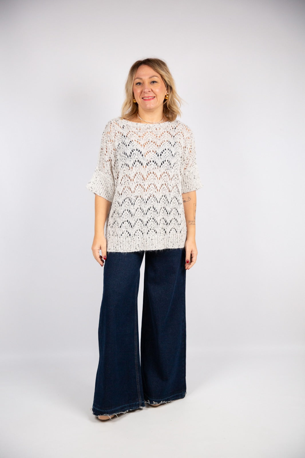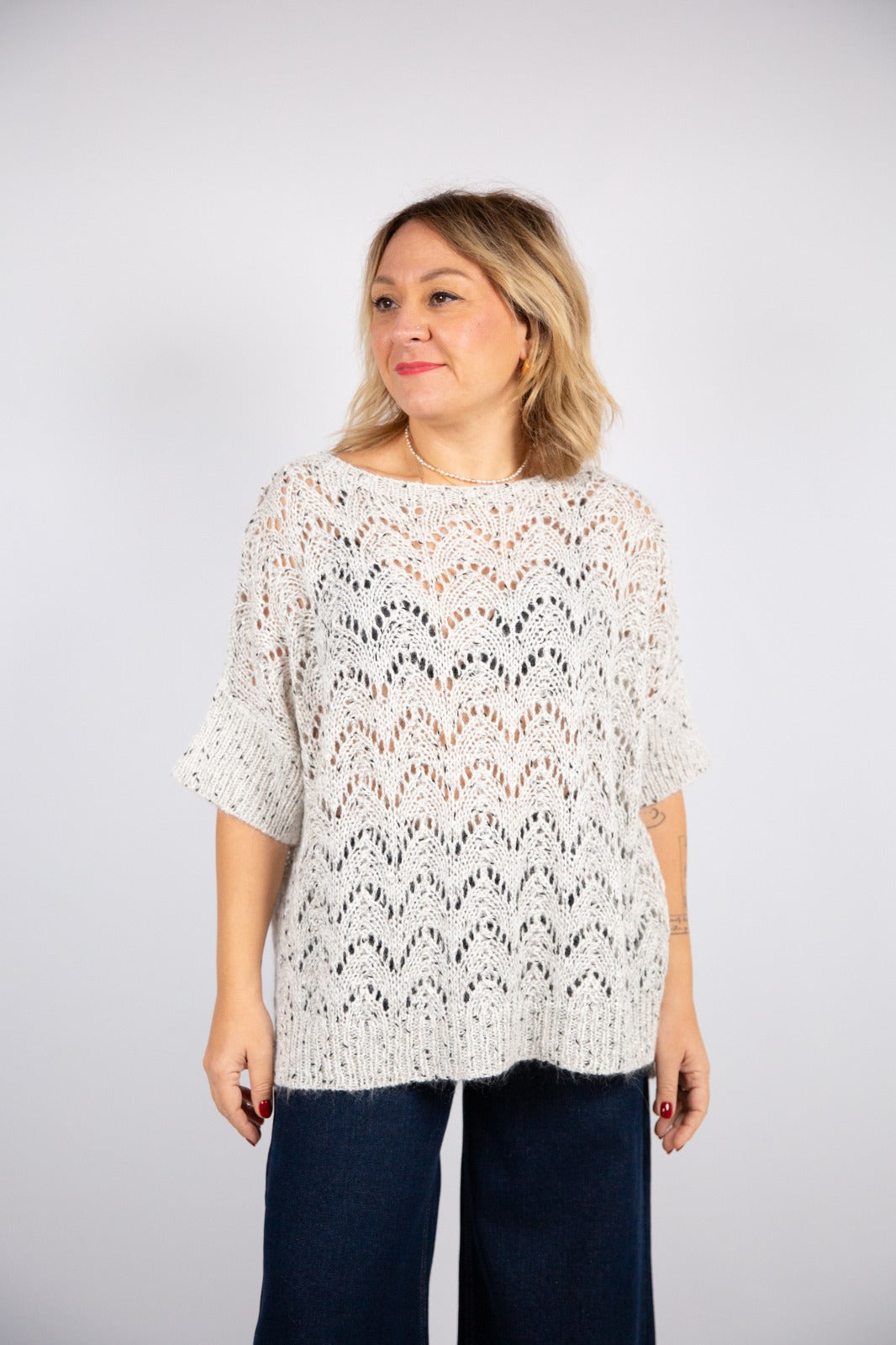 Maglia traforata in filato di misto lana, caratterizzata da un delicato effetto mélange nei toni del bianco, del grigio e del panna. Il modello è dritto e leggermente lungo, con maniche a tre quarti che aggiungono un tocco di leggerezza e femminilità. Morbida e confortevole, è perfetta per look casual ma curati, ideale per la mezza stagione.