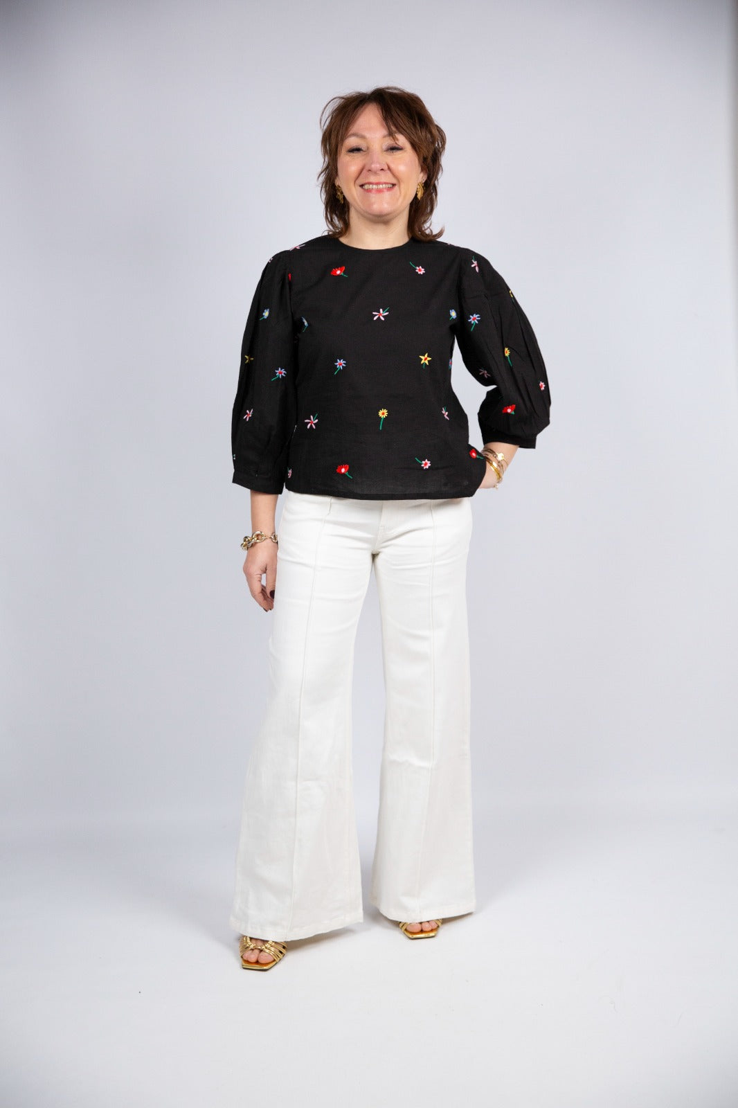 La manica a tre quarti a palloncino dona volume e femminilità, creando un raffinato gioco di proporzioni che valorizza la linea della blusa. Il design è impreziosito da fiori colorati ricamati a mano, veri dettagli artigianali che risaltano sul fondo scuro e rendono ogni capo unico. Una blusa ricercata e versatile, perfetta per dare personalità sia a look quotidiani che a outfit più eleganti.