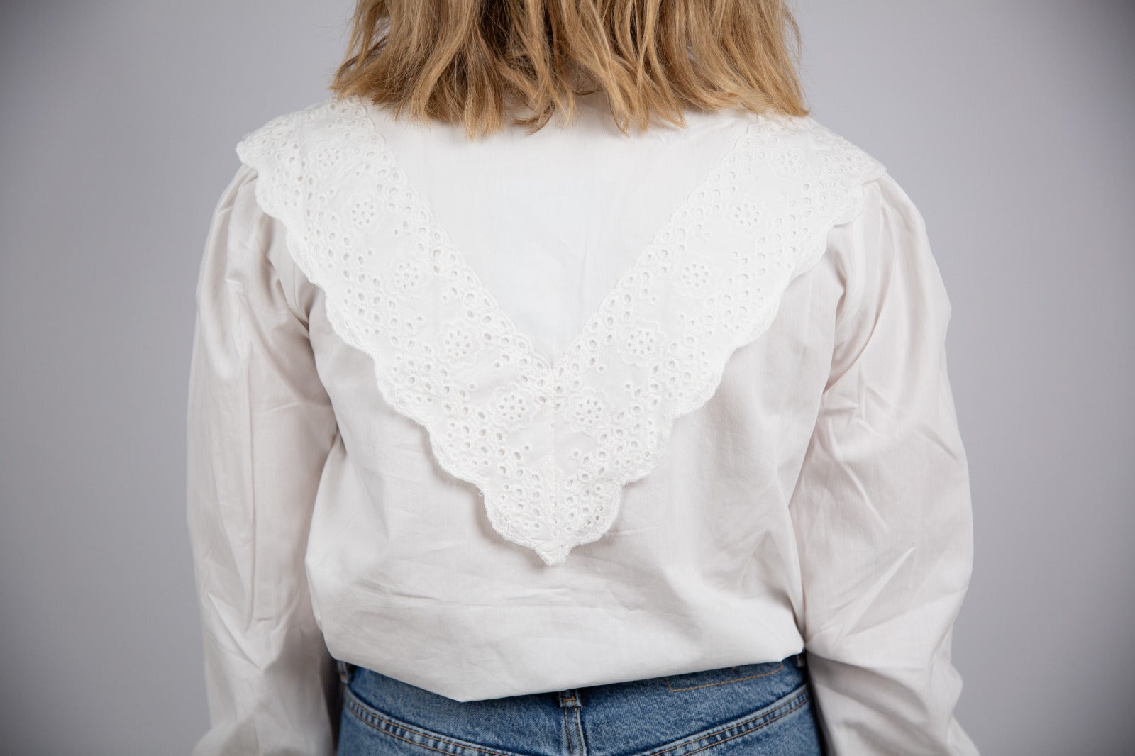 Camicia bianca in puro cotone dalla linea leggermente sfiancata, impreziosita da un ampio e importante collo in sangallo che dona un tocco romantico e raffinato. Il dettaglio in pizzo si ripete anche nella parte posteriore, creando un effetto armonioso e ricercato che rende il capo elegante ma facile da indossare nella quotidianità.