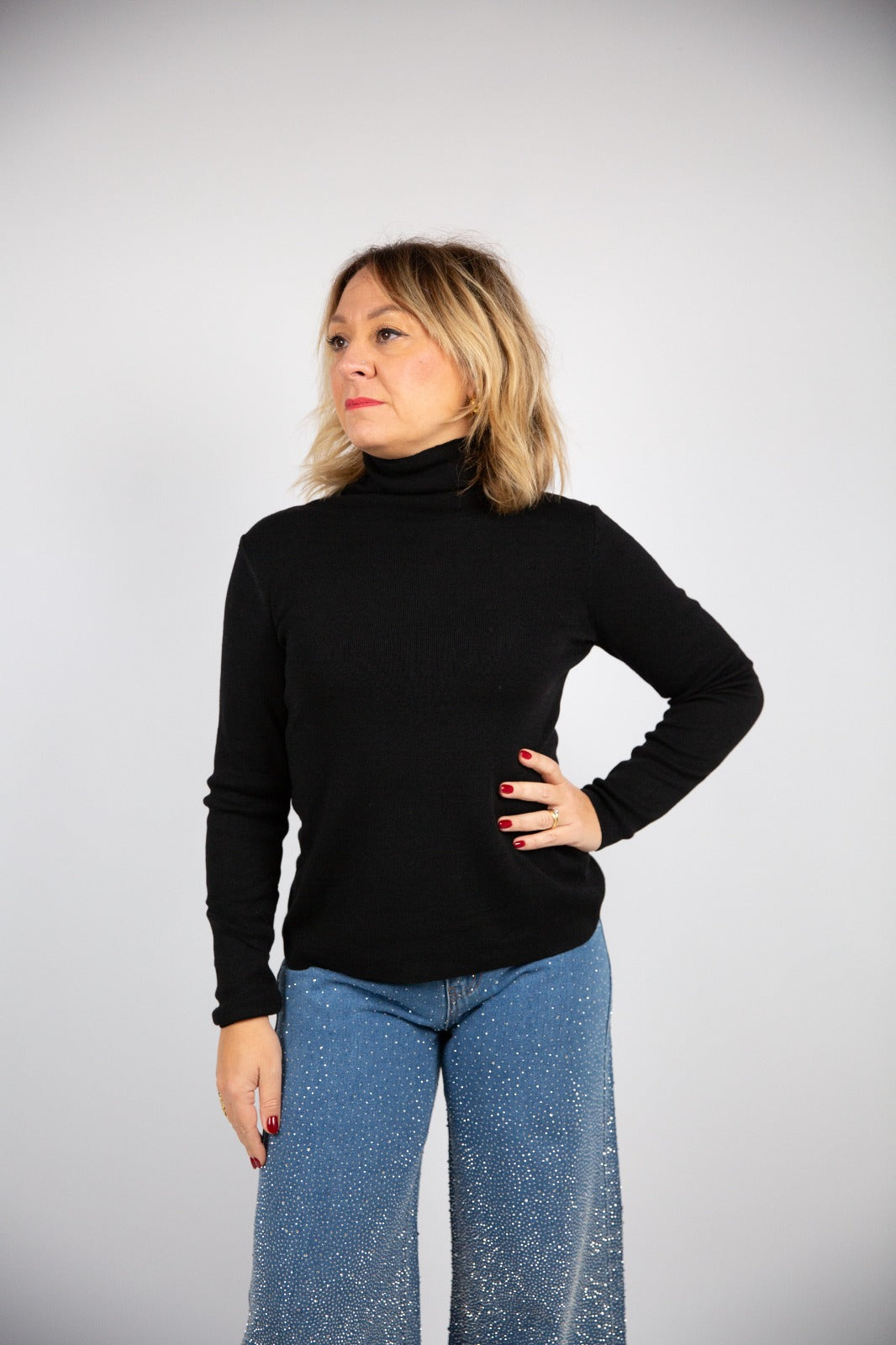Top con tessuto a maglia fine di colore nero. Con collo alto e maniche lunghe.misto lana 6%