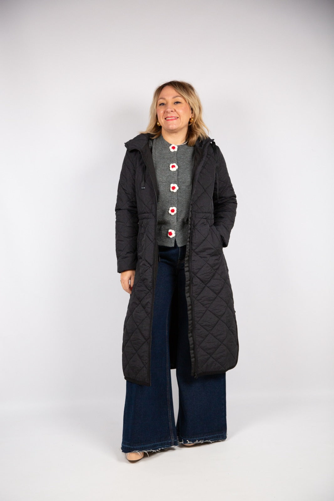 Cappotto con tessuto trapuntato nero. Collo alto con cappuccio regolabile e maniche lunghe rifinite con polsino elastico. Chiusura frontale con cerniera. Tasche laterali. Fodera interna.