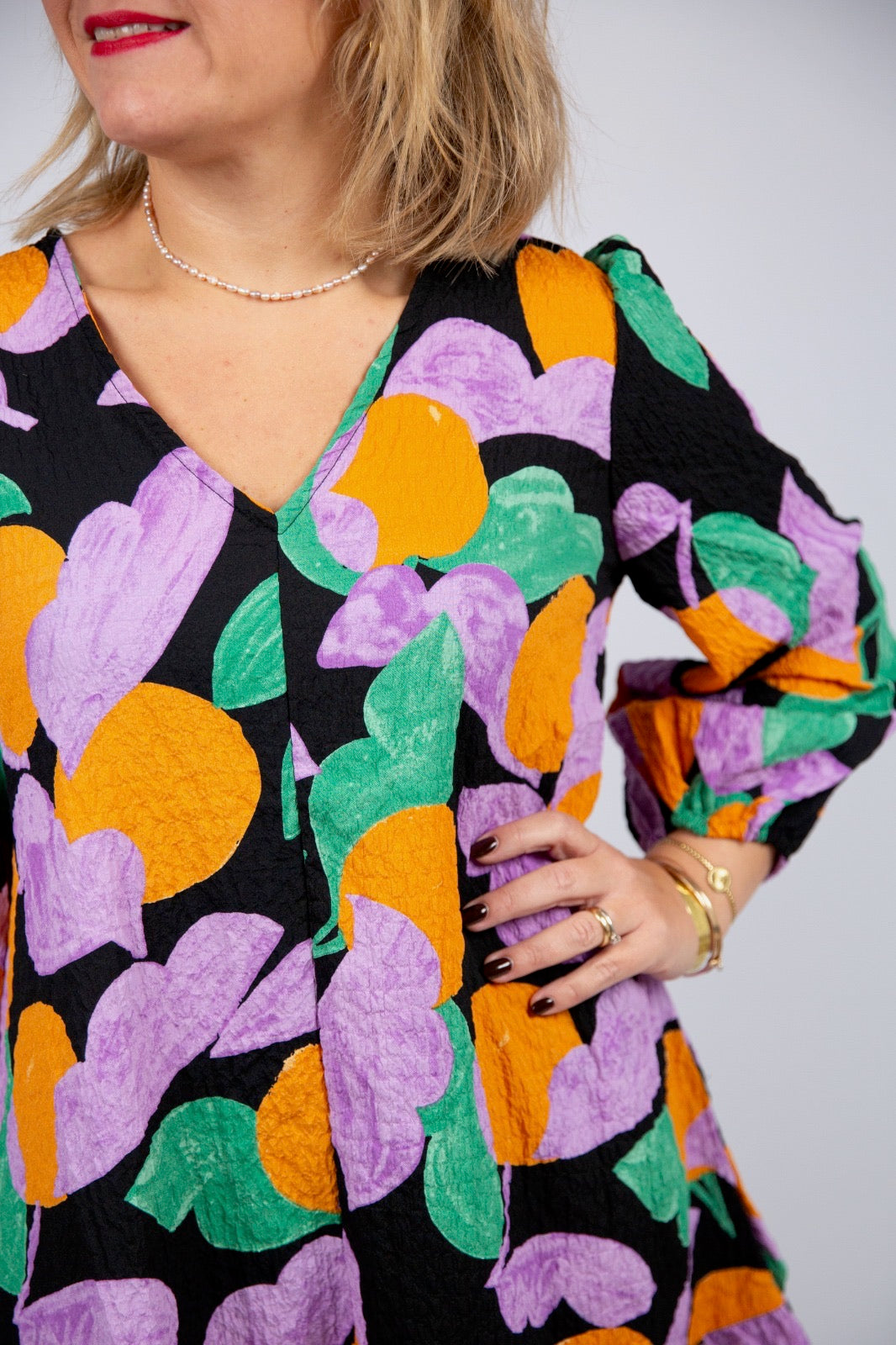 Abito corto in tessuto groffato con stampa .Scollo a V e manica lunga rifinita con polsino elastico. Vita allacciata. Tasche laterali.
