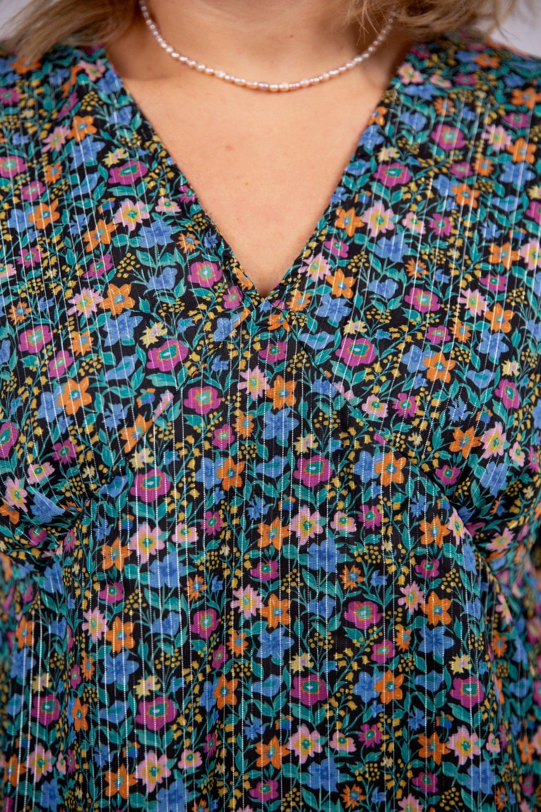 Abito corto in tessuto lurex crepe con stampa Flowers Lurex. Collo con scollo a V e maniche lunghe rifinite con polsino elastico. Gonna con dettagli di volant sulla gonna. Fodera interna.