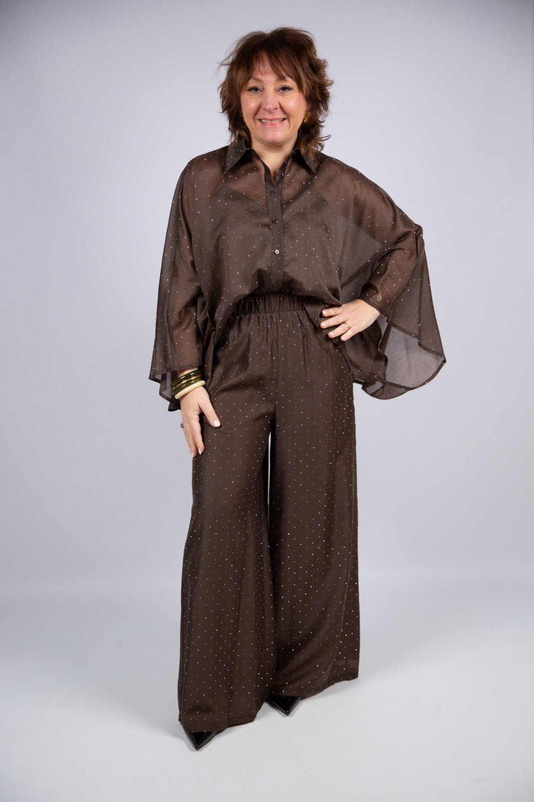 Pantalone color cioccolato dal fascino caldo e sofisticato, pensato per completare perfettamente la blusa coordinata e creare un insieme armonioso e ricercato. Il modello a palazzo doppiato dona struttura e movimento, mentre l’elastico in vita assicura comfort e una vestibilità fluida che accompagna la silhouette con naturalezza. La caduta morbida del tessuto valorizza ogni passo, rendendolo ideale sia per un look elegante e curato sia per un outfit più rilassato ma sempre di grande stile. Un capo versatile, bello e di carattere, capace di distinguersi con semplicità.