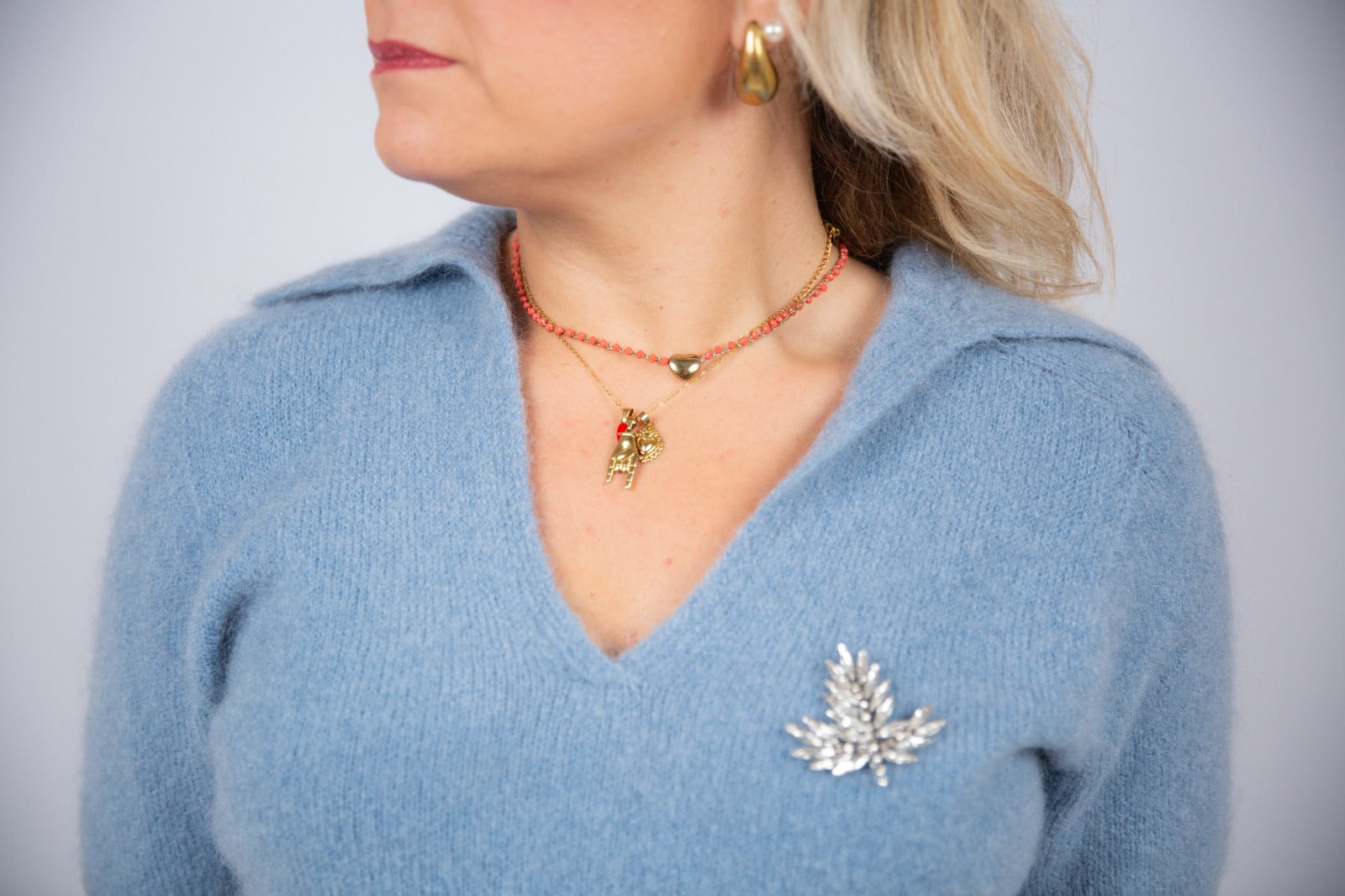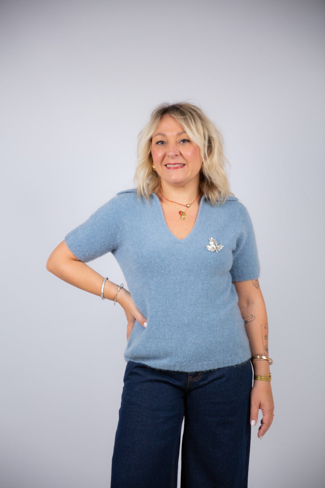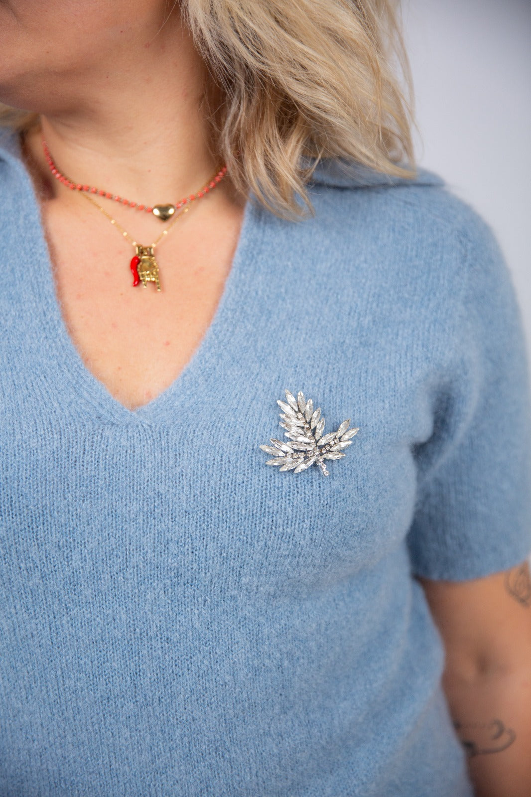 Maglia mezza manica con collo a V e spilla Swarovski – Azzurro polvere