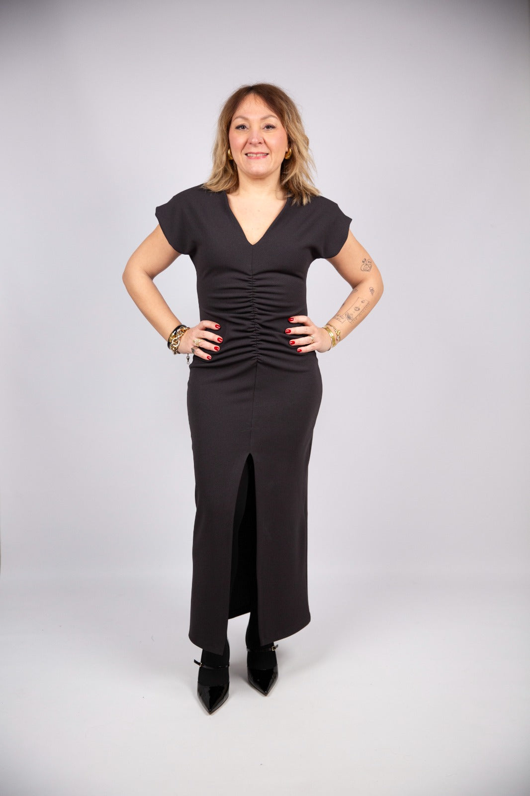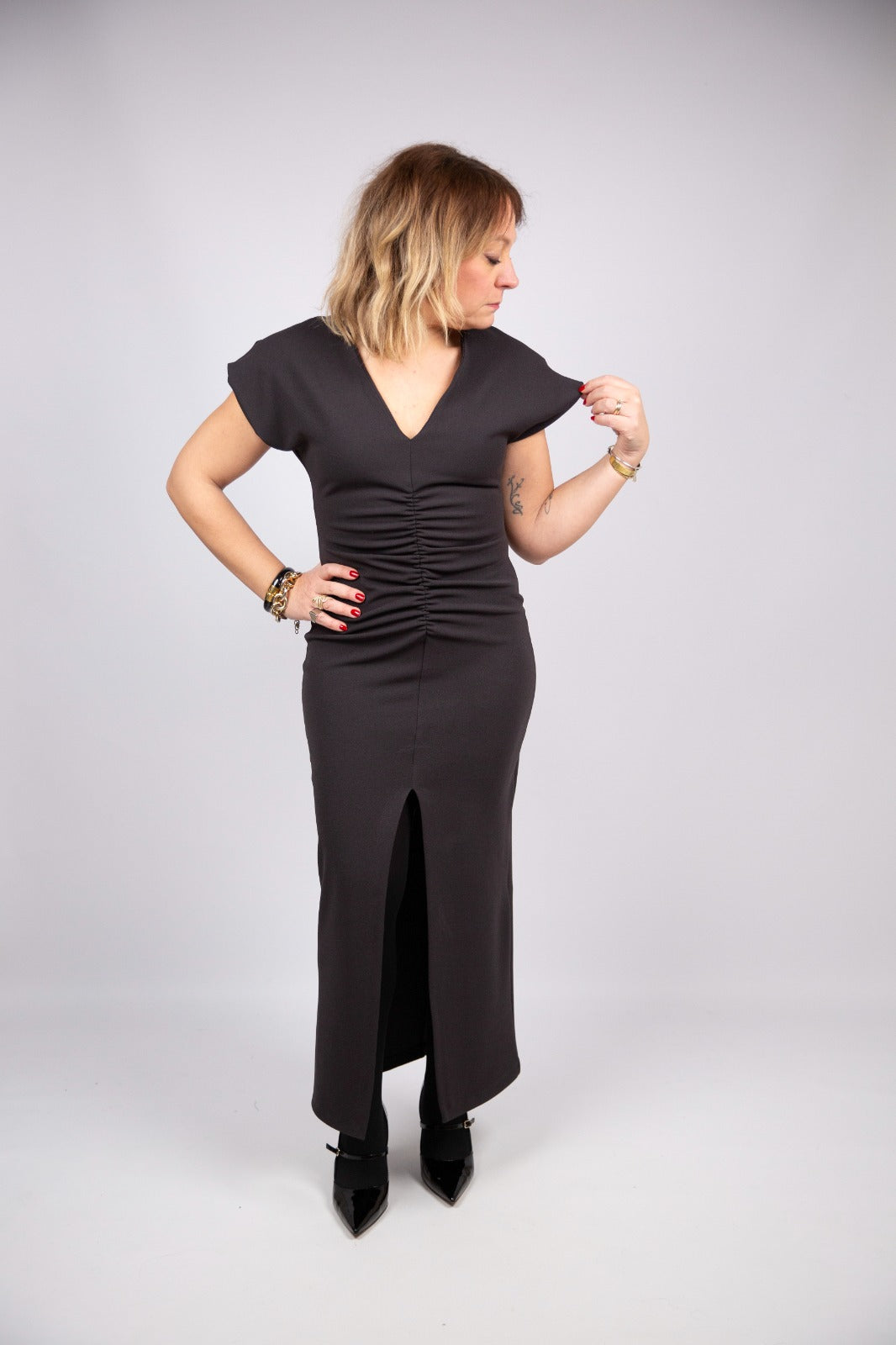 Vestito color grigio canna di fucile dal gusto elegante e contemporaneo. Le maniche scese a spallotto donano un tocco femminile e raffinato, mentre lo scollo a V valorizza il décolleté con discrezione. L’arricciatura nella parte frontale esalta la silhouette creando movimento, completata da uno spacco che aggiunge sensualità e slancio al capo. Un abito versatile e molto chic, perfetto per occasioni speciali ma anche per look serali curati.