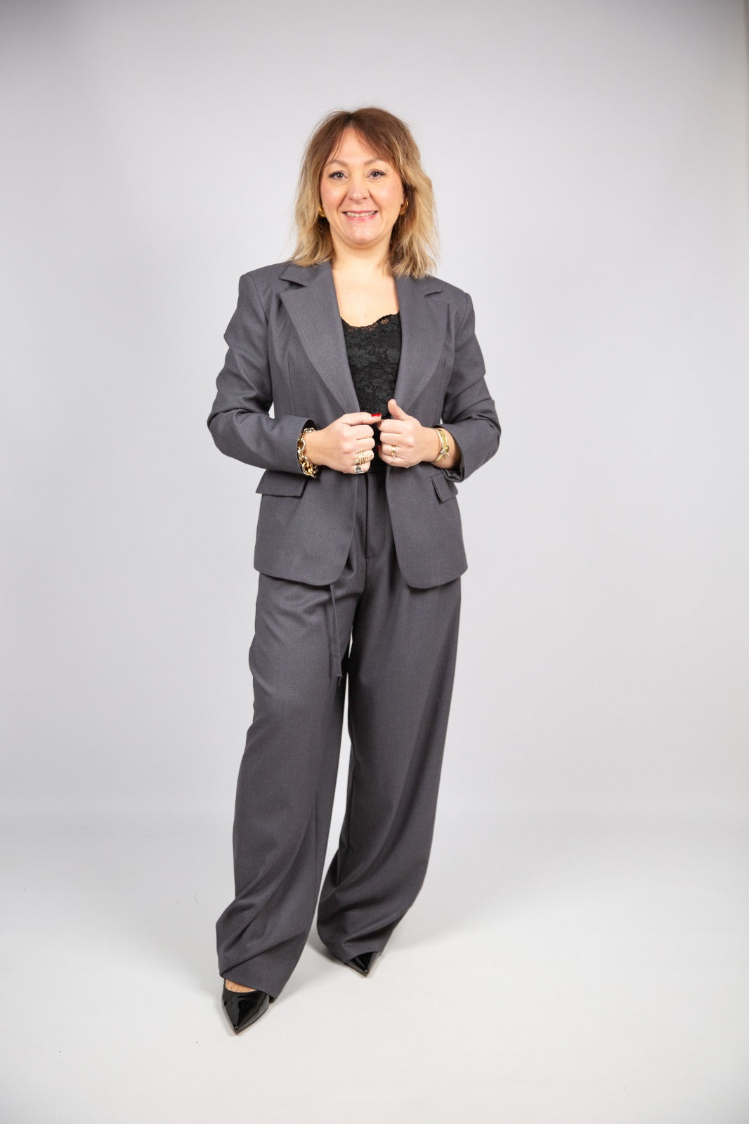 Tailleur dal carattere deciso e contemporaneo, composto da pantalone dal taglio maschile che dona struttura e personalità al look. Il modello è completato da una piccola cinturina realizzata nello stesso tessuto del pantalone, dettaglio che definisce la vita con discreta eleganza. La giacca, piuttosto sciancrata e corta, bilancia le proporzioni valorizzando la silhouette e aggiungendo un tocco femminile e moderno all’insieme. Un completo versatile e raffinato, ideale per chi ama uno stile sartoriale rivisitato in chiave attuale.