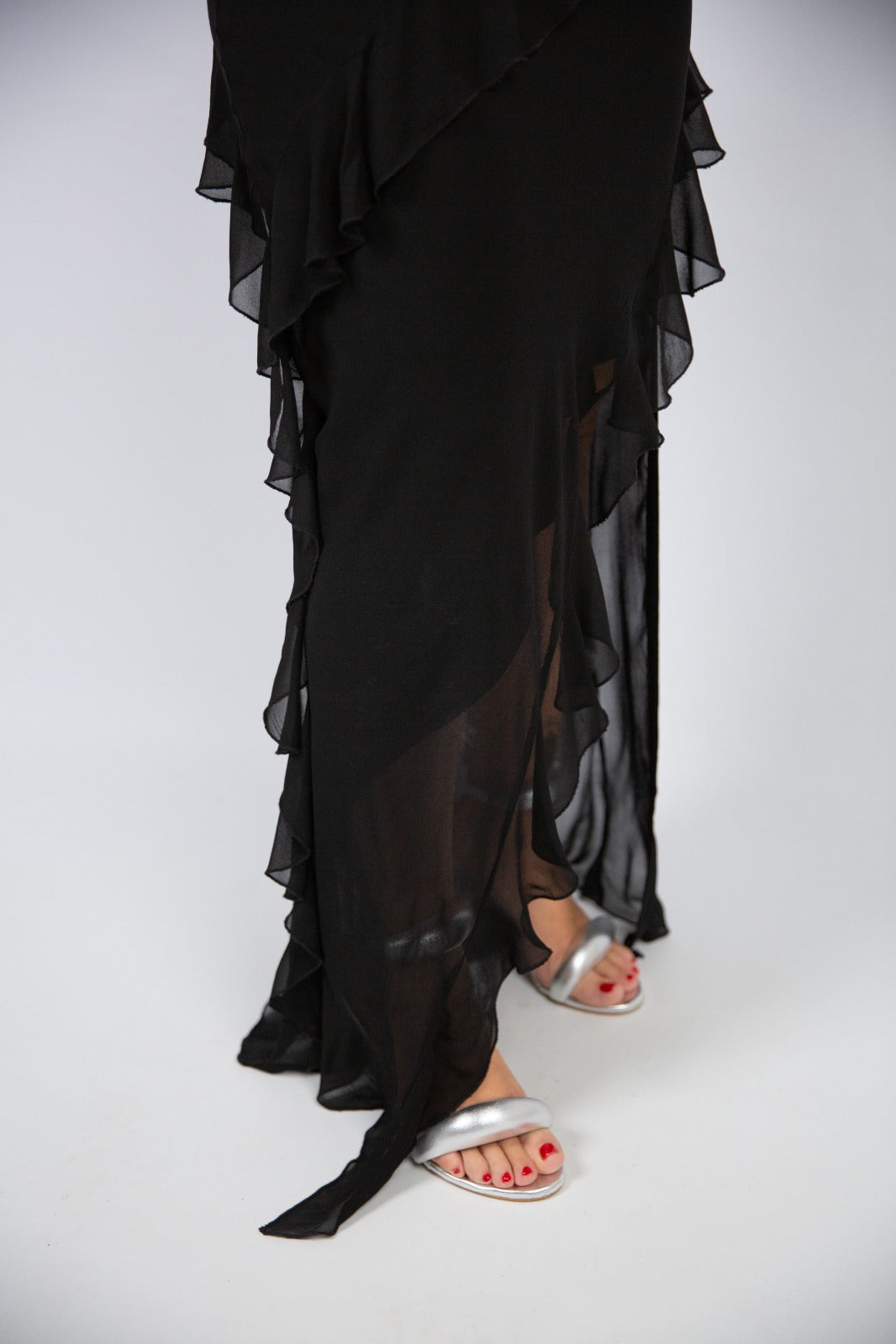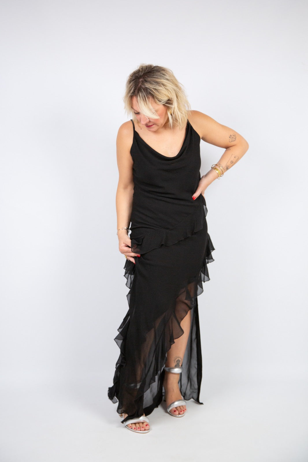 Abito lungo in 100% poliestere con sottoveste integrata, caratterizzato da uno spallino regolabile che garantisce una vestibilità personalizzata. Lo scollo drappeggiato dona eleganza e struttura al design, mentre le rouge aggiungono un tocco romantico e leggero. Lo spacco completa il capo con un dettaglio sensuale e dinamico.