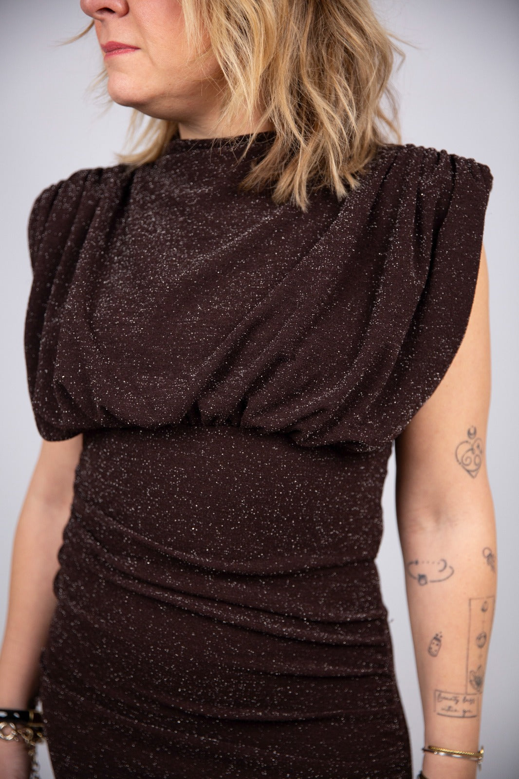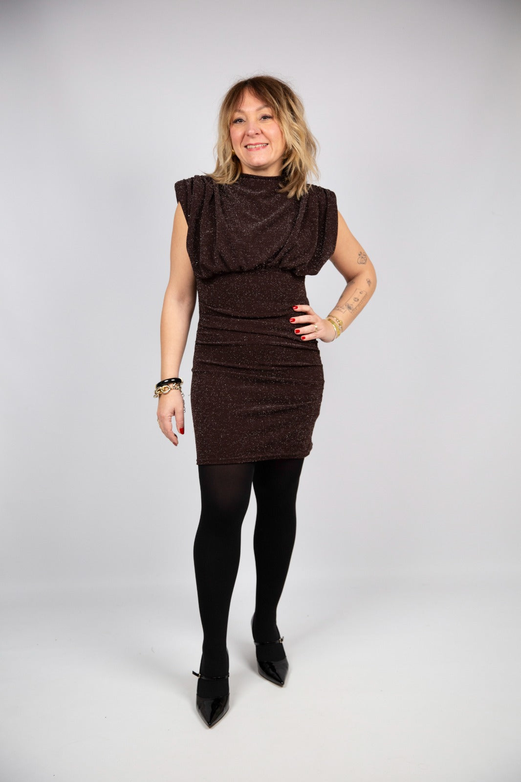 Questo abito corto in tessuto glitterato marrone scuro unisce eleganza e modernità. La silhouette aderente esalta la figura, mentre le maniche a spallotto e il dettaglio drappeggiato sul busto aggiungono un tocco di originalità e femminilità. Perfetto per eventi serali o occasioni speciali, questo abito è una scelta sofisticata e di tendenza, ideale per chi desidera brillare con stile.