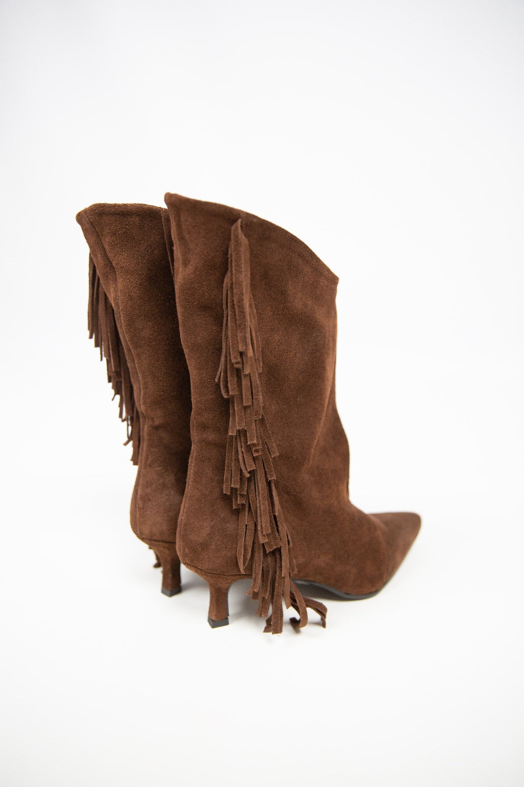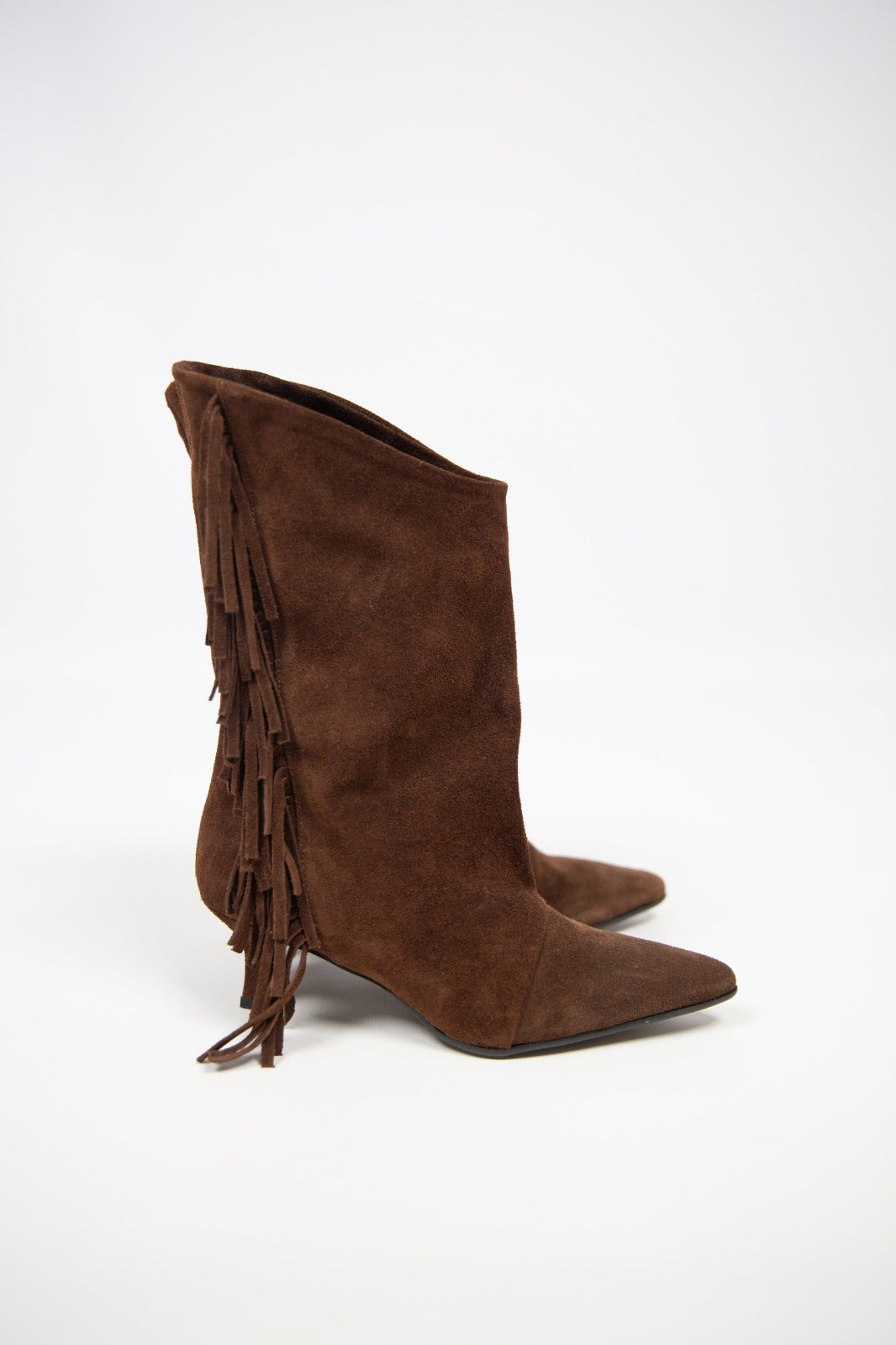 Stivale in camoscio color testa di moro, dal carattere deciso e ricercato. Il gambale a mezza gamba presenta una linea asimmetrica impreziosita da frange morbide che donano movimento e personalità al design. Il tacco da 6 cm assicura comfort e stabilità, rendendolo perfetto da indossare tutto il giorno senza rinunciare allo stile. Un modello versatile ma distintivo, ideale per valorizzare sia look casual che più curati.