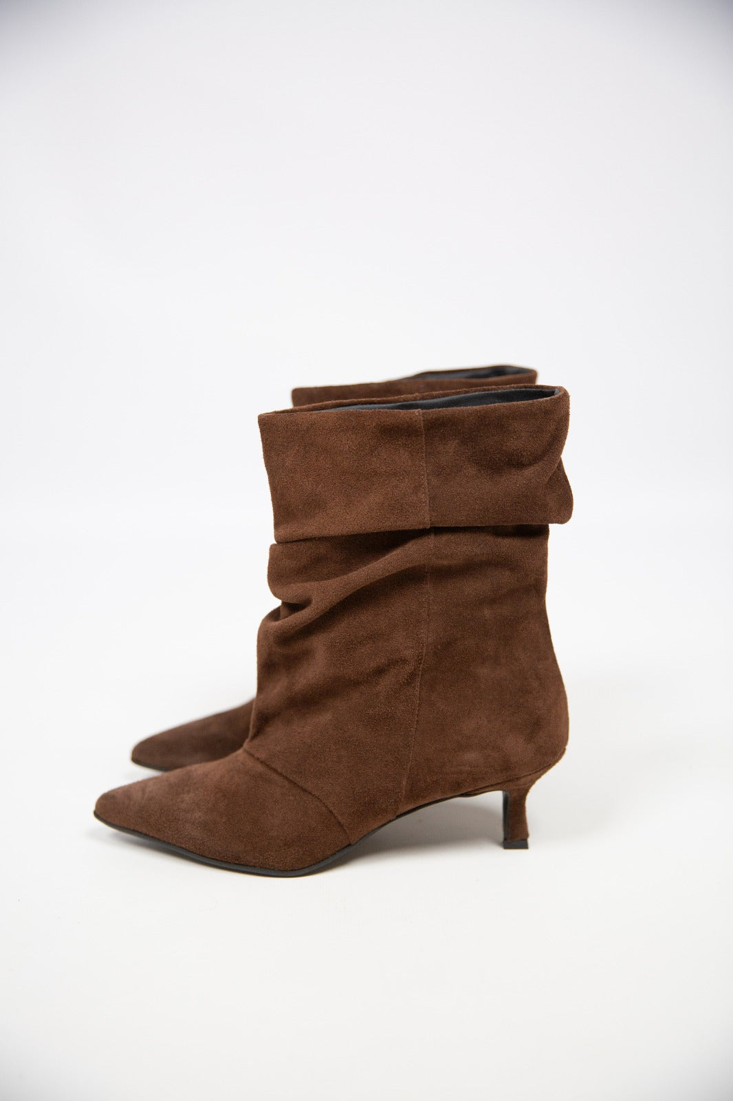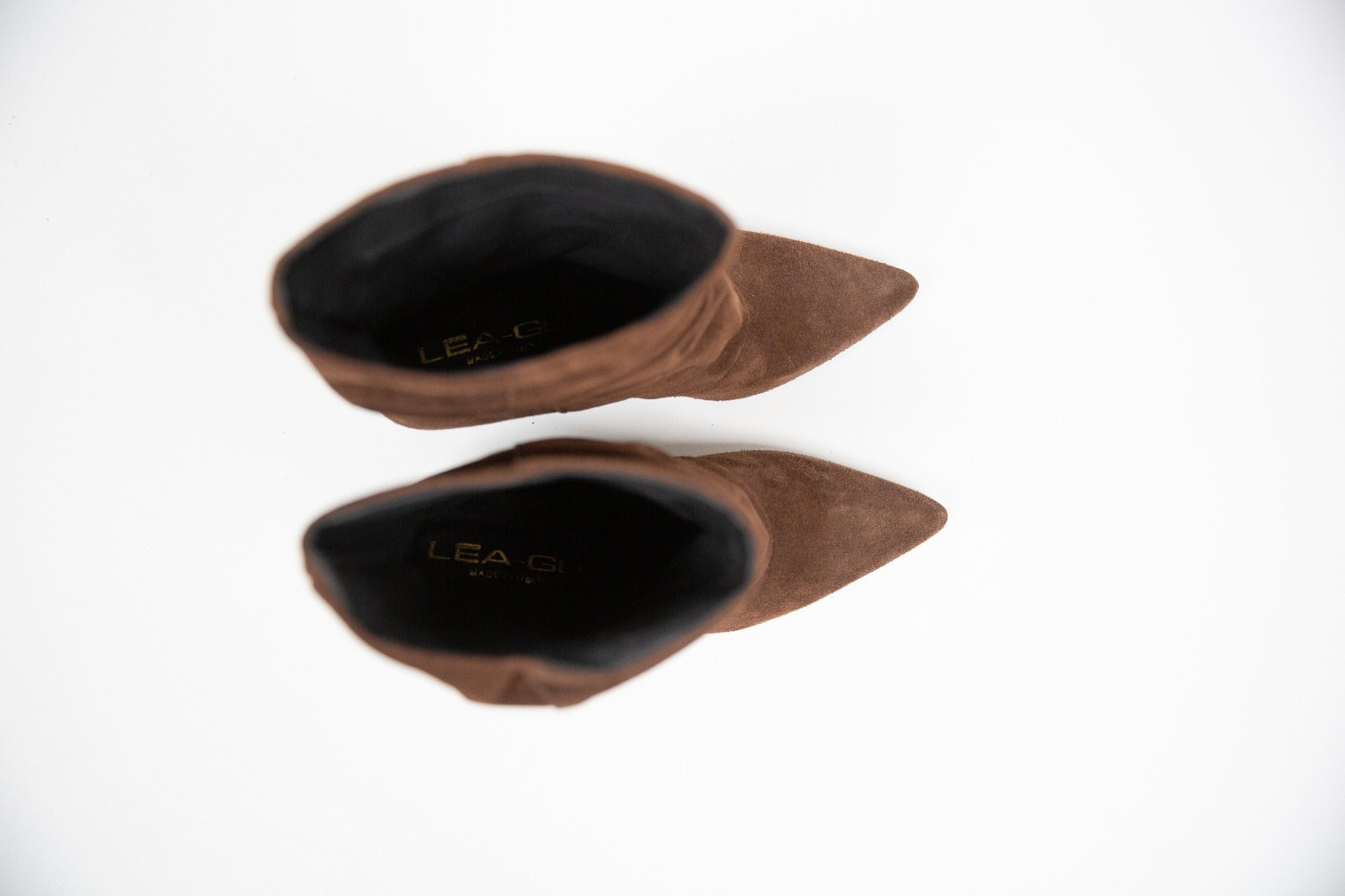 Stivale in camoscio color testa di moro, elegante e versatile. Il modello a mezza gamba con lavorazione arricciata dona morbidezza alla linea e un effetto naturale e raffinato. Il tacco da 6 centimetri garantisce il giusto equilibrio tra comfort e femminilità, rendendolo ideale per l’uso quotidiano ma perfetto anche per completare look più ricercati. Un must intramontabile per la stagione.