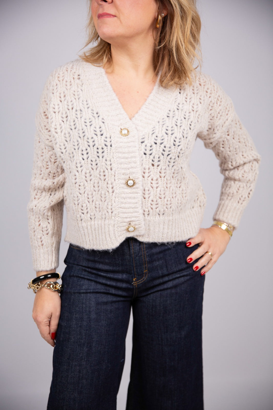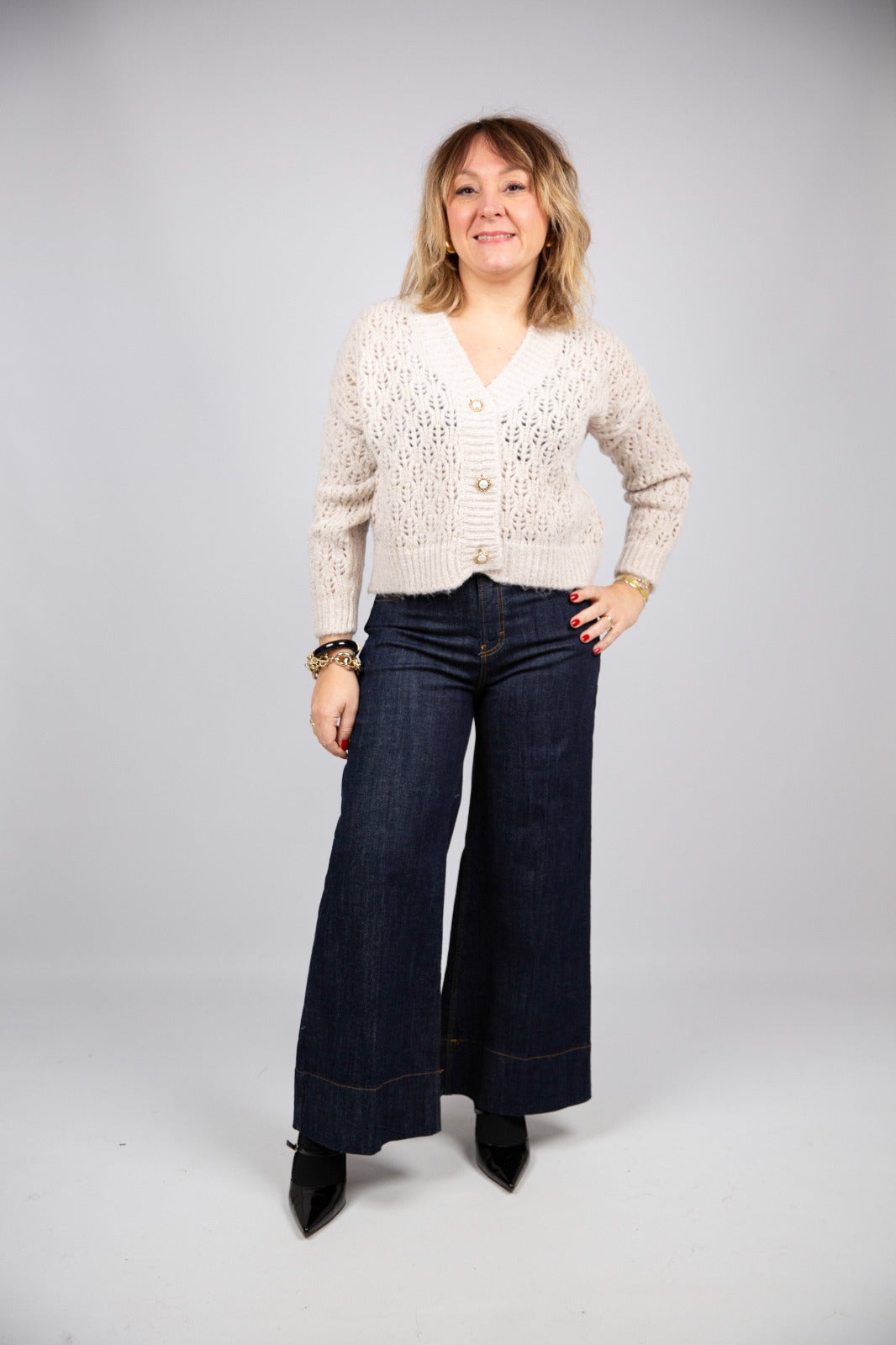 Il maglione cardigan in misto lana si caratterizza per una lavorazione traforata che dona leggerezza e raffinatezza al capo, lasciando intravedere al suo interno delicati fili di lamé che aggiungono una luminosità discreta ed elegante. La texture risulta ricca ma armoniosa, con un equilibrio perfetto tra calore e ricercatezza. I bottoni a gioiello impreziosiscono ulteriormente il cardigan, diventando un dettaglio decorativo che valorizza il design e conferisce un tocco sofisticato. Nel complesso, il capo unisce comfort e femminilità, risultando ideale per arricchire anche gli outfit più essenziali con una nota luminosa e raffinata.