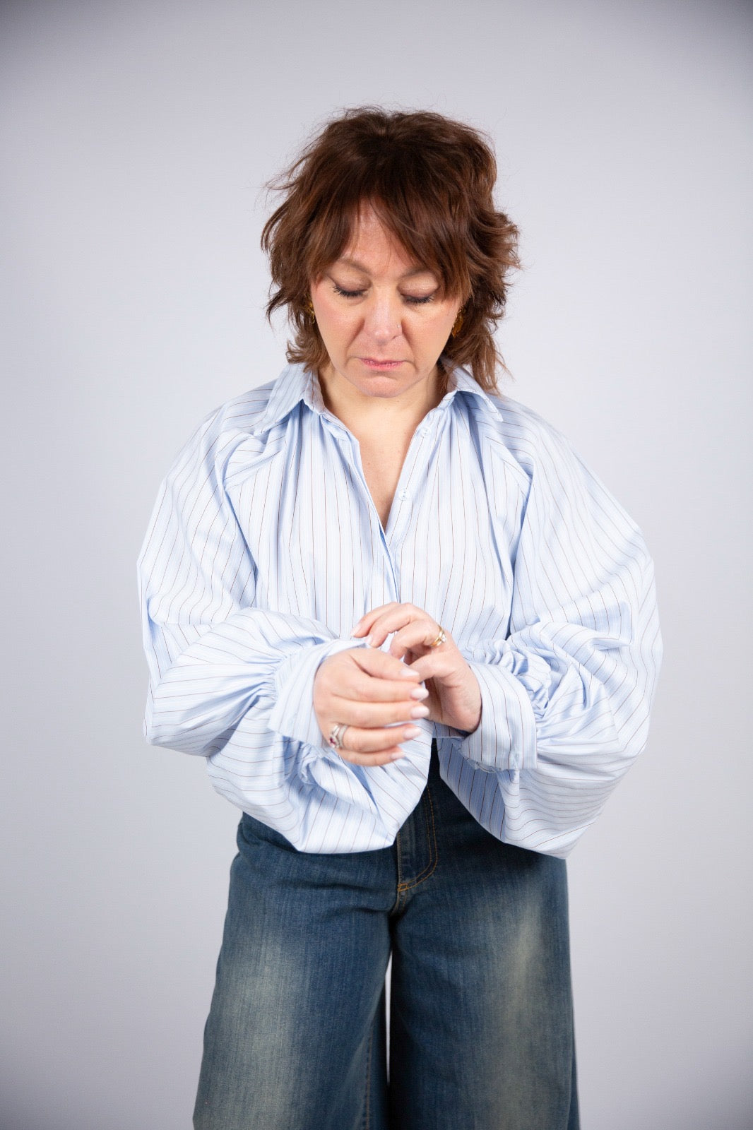 Questa camicia in 100% cotone a bastoncino bianco è un capo che unisce freschezza e carattere in modo raffinato. La righina sottilissima nel tono bruciato crea un contrasto delicato e sofisticato, perfetto per dare movimento senza appesantire. Il modello è valorizzato da leggere pince al collo che definiscono la linea con eleganza, mentre la manica ampia e molto ricca a sbuffo dona volume e personalità, trasformandola in un pezzo speciale ma facile da indossare. È la classica camicia che illumina anche l’abbinamento più semplice, rendendolo subito curato e distintivo.