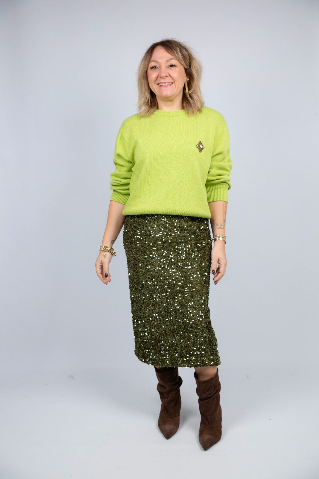 Questa gonna in velluto color olio ricoperta di paillettes unisce eleganza e grinta in un unico capo luminoso. Il modello tubino segue la figura con una vestibilità confortevole grazie all’elastico in vita, mentre lo spacco posteriore aggiunge movimento e un tocco sensuale senza rinunciare alla praticità. Perfetta per outfit serali o per dare carattere a un look più semplice.