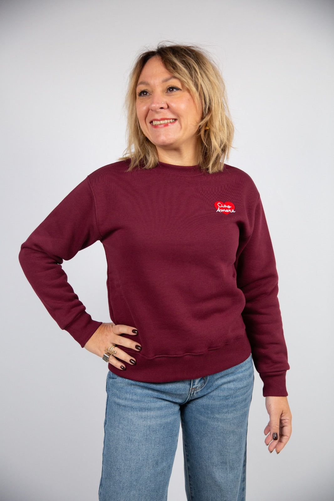 Felpa in 100% cotone, morbida e calda grazie all’interno felpato, con una vestibilità slim fit che valorizza la figura senza rinunciare al comfort. Il dettaglio della scritta “ciao amore” e il piccolo cuore ricamato in alto a sinistra aggiungono un tocco romantico e distintivo, perfetto per un look casual ma curato.