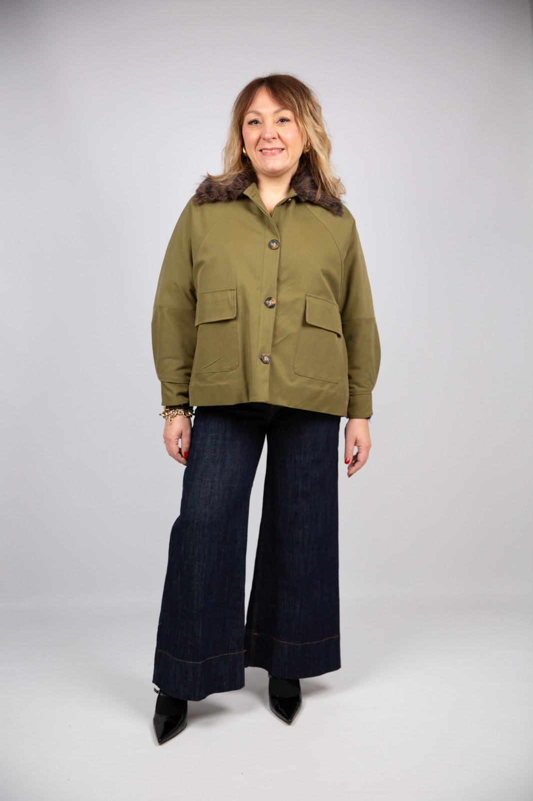 Tensione in giubbino verde militare collo ecopelliccia