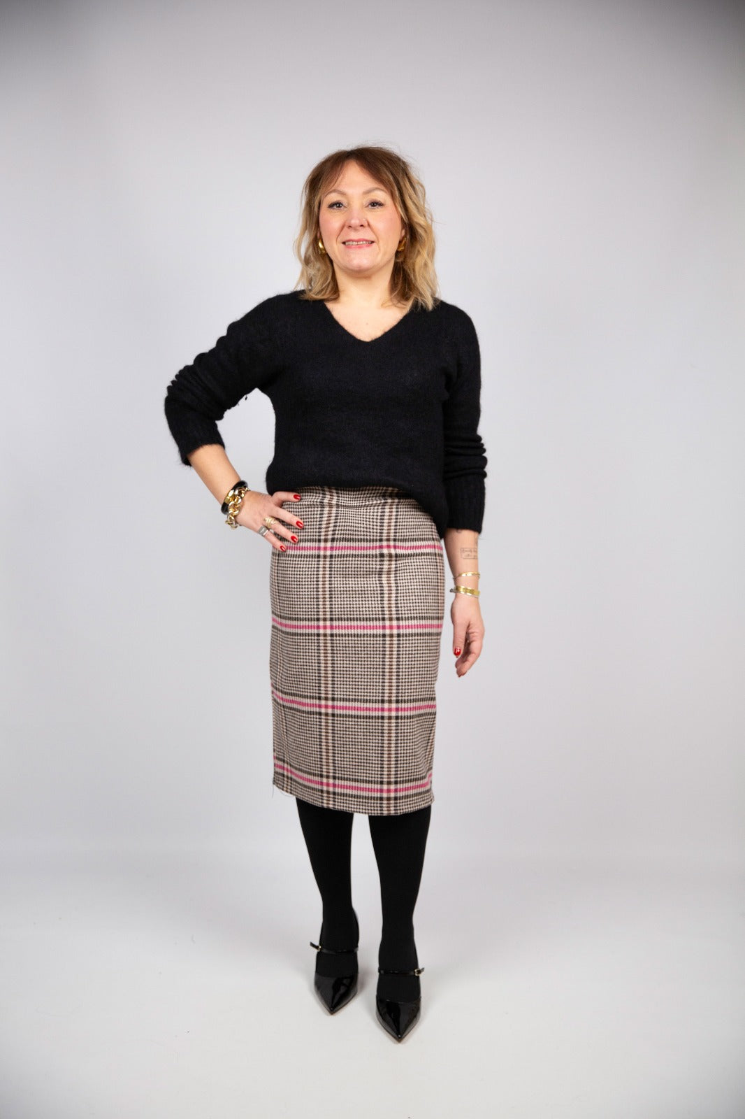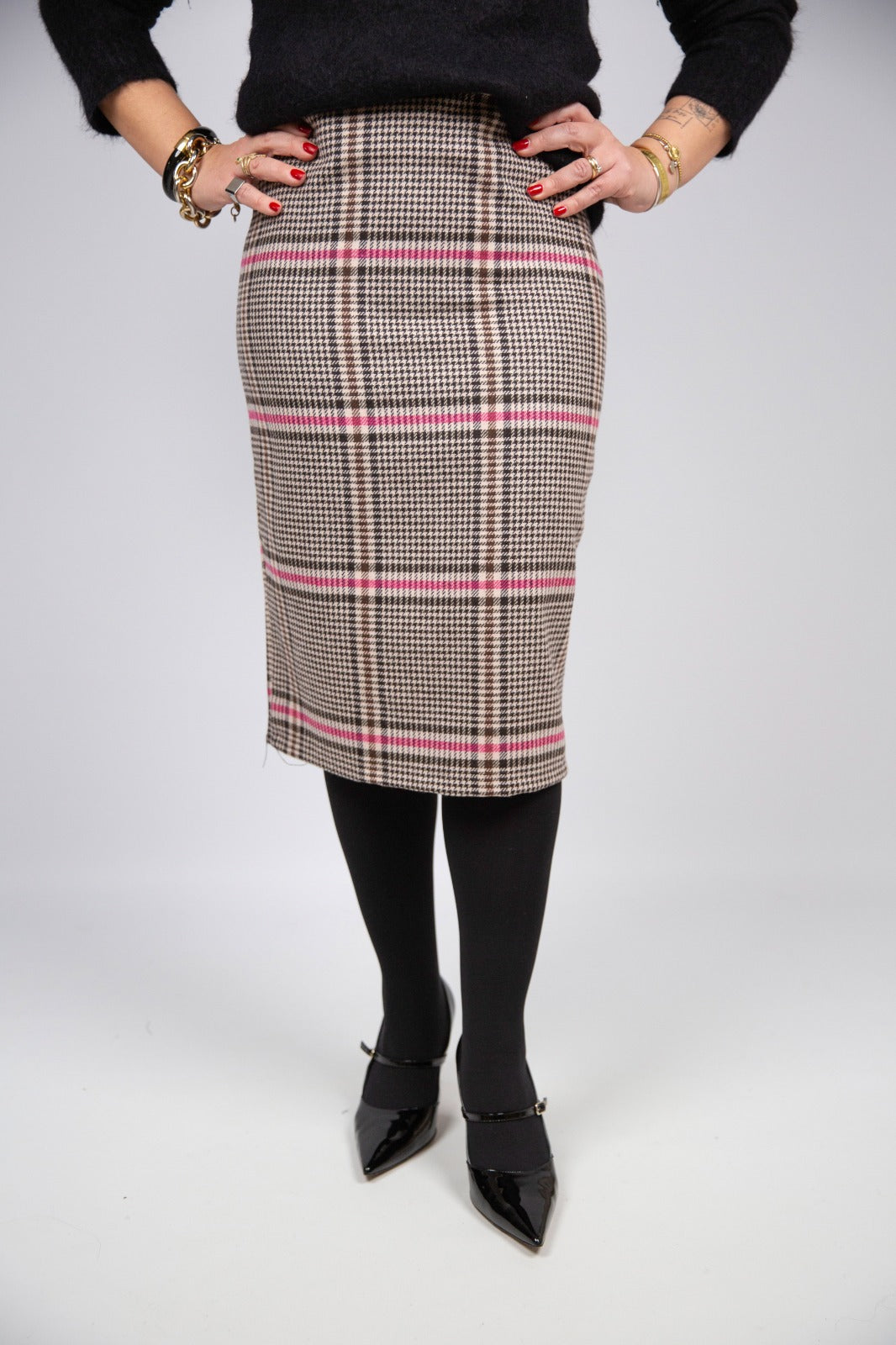 La pencil skirt in check nei toni del marrone, fucsia e beige si distingue per una linea affusolata ed elegante che valorizza la silhouette con sobrietà. Il motivo a quadri, vivace ma armonioso, unisce nuance classiche a un accento più deciso, rendendo il capo distintivo e contemporaneo. Realizzata in misto lana, offre una struttura confortevole e una piacevole sensazione di calore, risultando ideale per la stagione più fresca. Versatile e raffinata, questa gonna è pensata per completare con carattere sia look formali sia abbinamenti più casual.