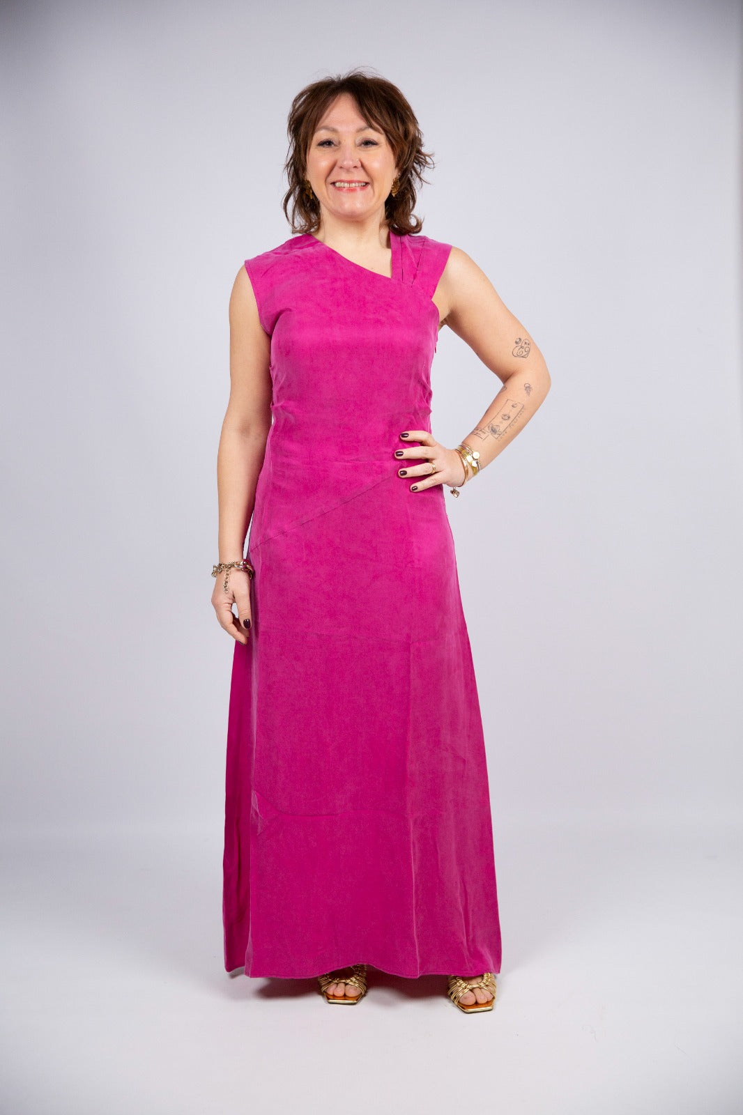 La scollatura è il vero punto focale: non un classico scollo a V centrale, ma una sorta di V decentrato, leggermente in diagonale, come se il taglio fosse stato fatto di spieco. Questo crea un effetto dinamico e contemporaneo, molto elegante, che allunga visivamente il busto e dona carattere all’abito senza risultare troppo audace.