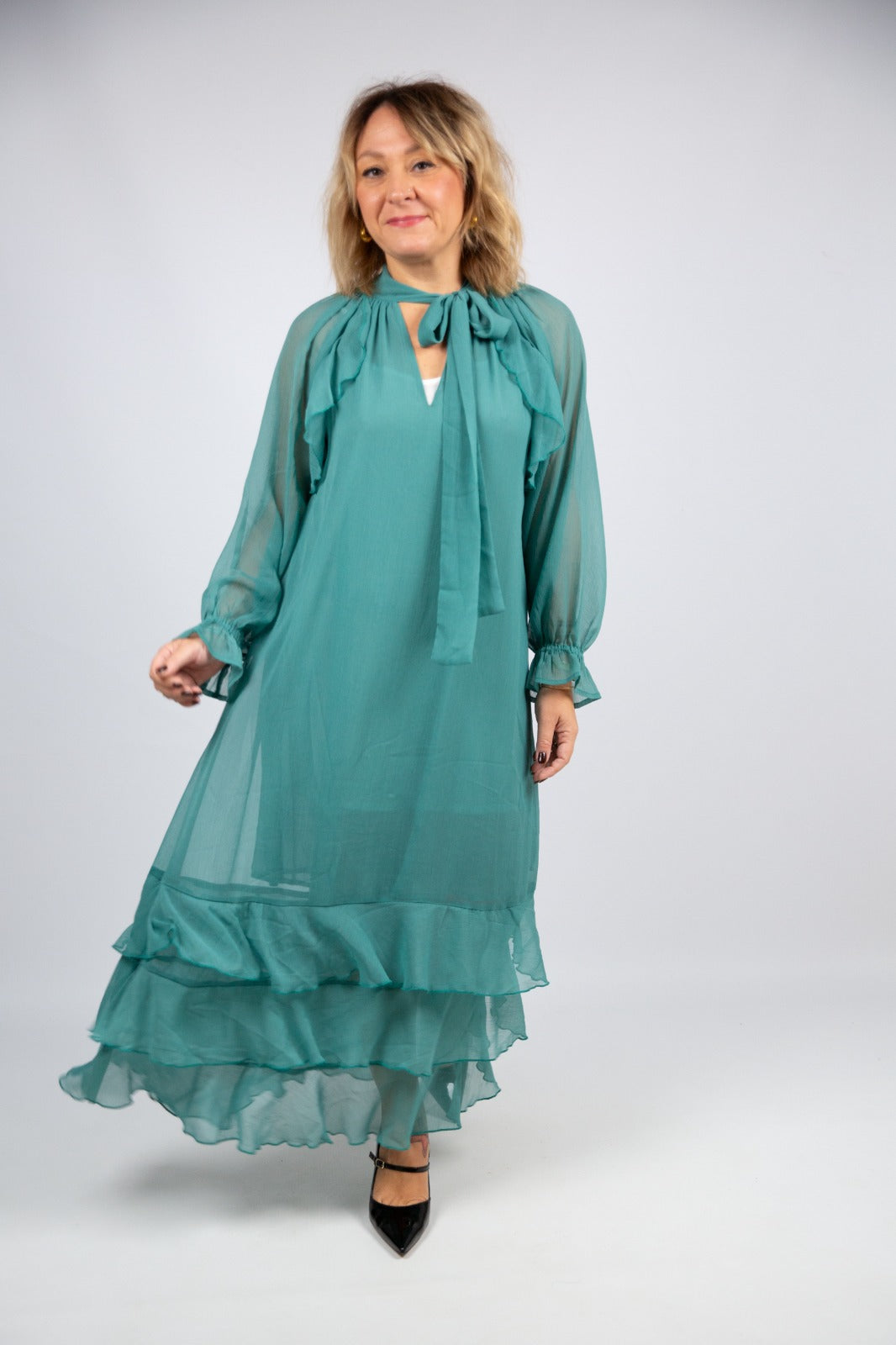 Abito midi in delicato light blu, caratterizzato da un design romantico e femminile. Le maniche e l’orlo sono impreziositi da morbide rouge che donano movimento e leggerezza, mentre il collo si chiude con un fiocco che aggiunge un tocco elegante e raffinato.